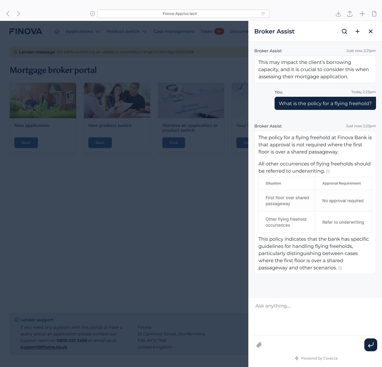 Finova will integrate Covecta’s advanced AI engine into its product suite, beginning with the introduction of new support agent capabilities across Finova’s lending and broker platforms.
