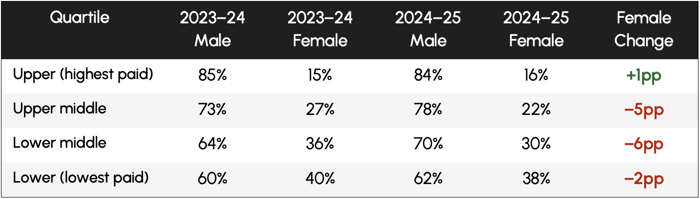 These movements are also reflected in the overall headcount split, which shifted 2% in the wrong direction during this reporting period. We recognise this as a step back and have taken it seriously, particularly as the upper-middle quartile is where the shift has been most pronounced. The actions we are taking to address this are outlined in the section below.